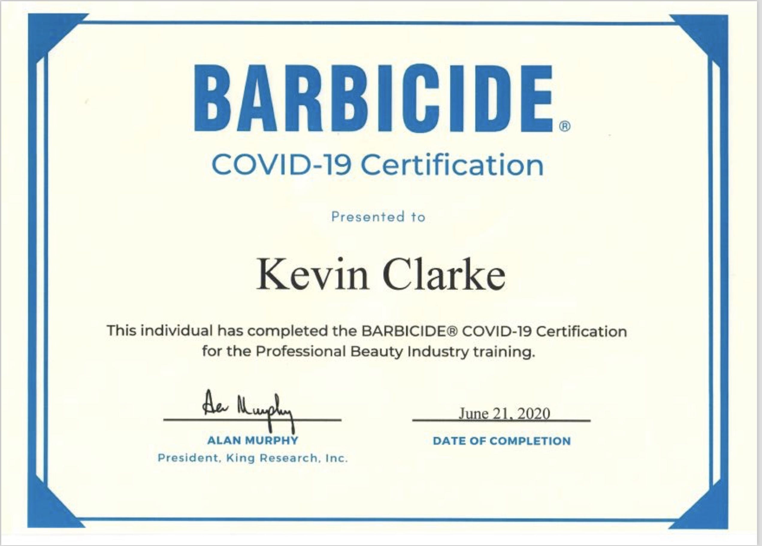 Cutting Edge has taken a number of steps to ensure that both staff and customers are safe during the Covid-19 pandemic when reopening on the 4th July 2020. Please find attached recent certification awarded to Kevin as manager of Cutting Edge for infection control training for the barber industry.